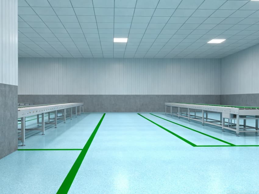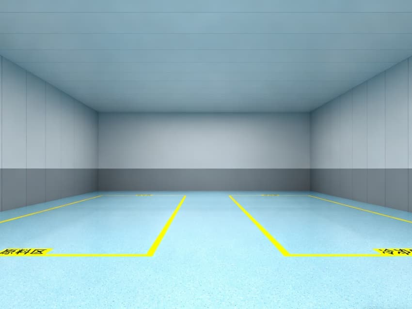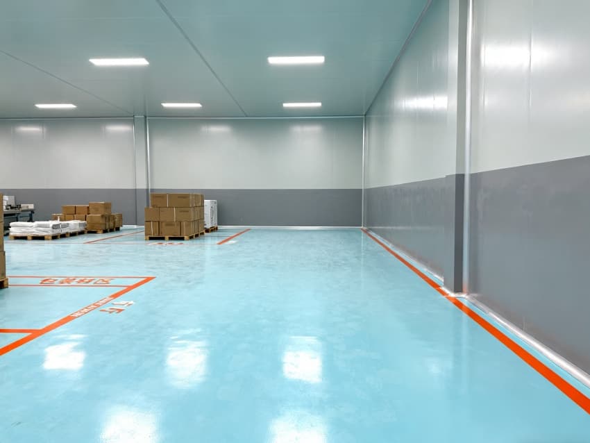 車(chē)間統(tǒng)一采用淺藍(lán)色耐磨環(huán)氧地面,兼具抗沖擊、易清潔特性,適配鈑金加工、總裝等多環(huán)節(jié)的設(shè)備安裝與物料轉(zhuǎn)運(yùn)需求;四周灰色防霉墻壁經(jīng)耐污處理,耐磨損且不易顯臟,配合頂部均勻布光系統(tǒng),營(yíng)造明亮舒適的生產(chǎn)環(huán)境。?