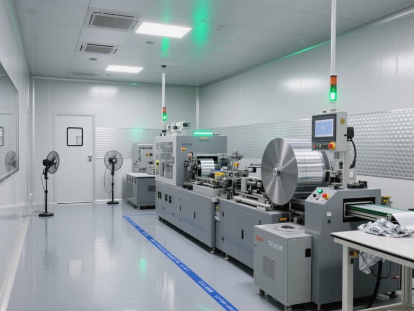 車間以銀灰色抗菌金屬彩鋼板搭建墻體與吊頂,搭配淺灰色防靜電環氧地坪,金屬質感的建材兼具抗電解液腐蝕、易清潔特性,地面藍色防靜電標識線清晰劃分涂布、卷繞、裝配等工序區域。頂部高效過濾器與定向層流系統,實現每小時18-22次空氣置換,配合除濕機組將濕度精準控制在20-30%RH,避免水分影響電芯性能。?