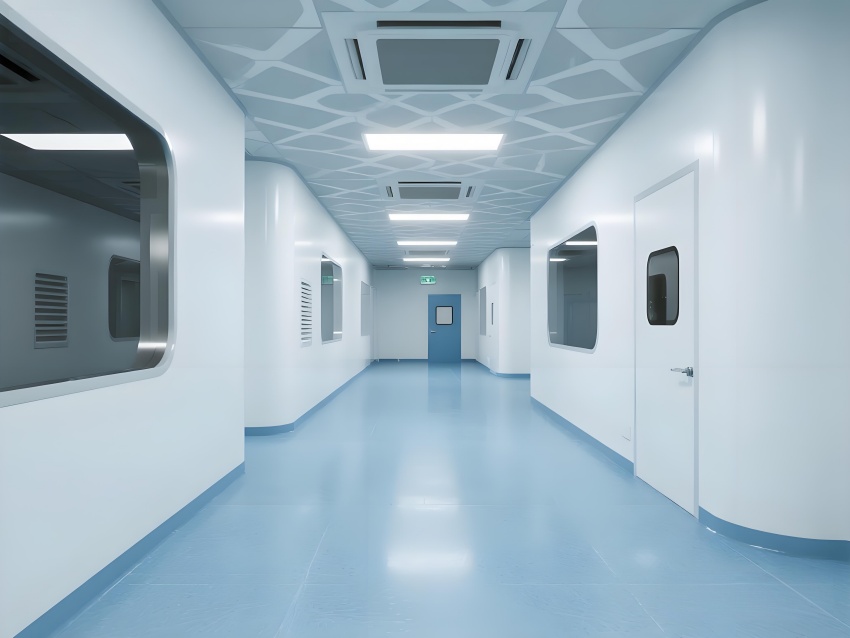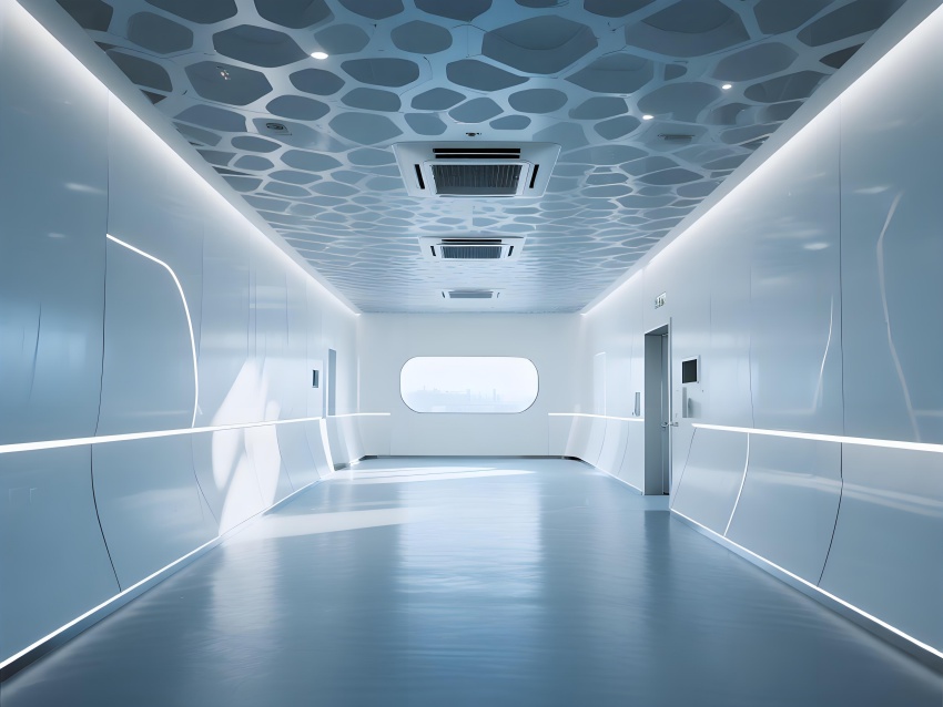 本車間空間以冰川藍(lán)與鈦白為主色調(diào),弧形墻角與無縫地坪構(gòu)成流暢的潔凈界面,頂部蜂窩狀FFU陣列形成科技感天花肌理。灌裝區(qū)透明亞克力防護(hù)罩展示自動(dòng)化生產(chǎn)線運(yùn)作,配合層流工作臺(tái)的紅色氣流可視化設(shè)計(jì),強(qiáng)化無菌核心概念。功能模塊通過地面灰色導(dǎo)視帶串聯(lián),設(shè)備區(qū)的鏡面不銹鋼與控制面板的藍(lán)色背光形成冷調(diào)光效。玻璃觀察窗嵌入電子壓差計(jì),走廊的漸變光環(huán)境引導(dǎo)系統(tǒng)在滿足GMP動(dòng)態(tài)監(jiān)測要求的同時(shí),營造出未來實(shí)驗(yàn)室般的專業(yè)氛圍,緩解員工長時(shí)間密閉作業(yè)的疲勞感。