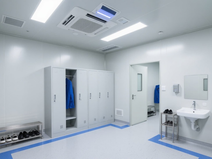 PCR實驗室是基因擴增與檢測的核心場所,嚴格遵循生物安全與潔凈標準。整體以灰白色抗菌彩鋼板為主體,搭配淺藍色防靜電地坪,通過藍色標識線清晰劃分試劑準備、樣本制備、擴增分析等獨立區域,形成單向流布局以防交叉污染。