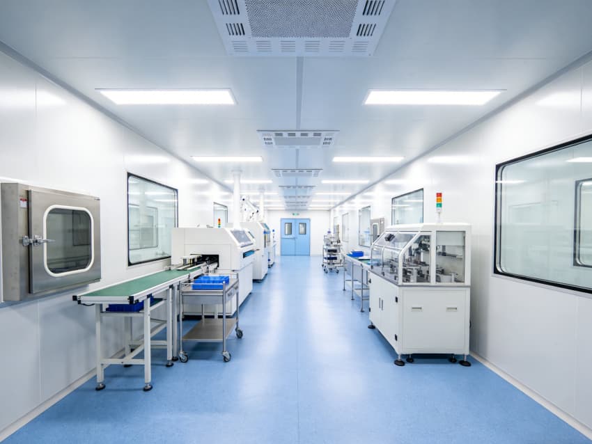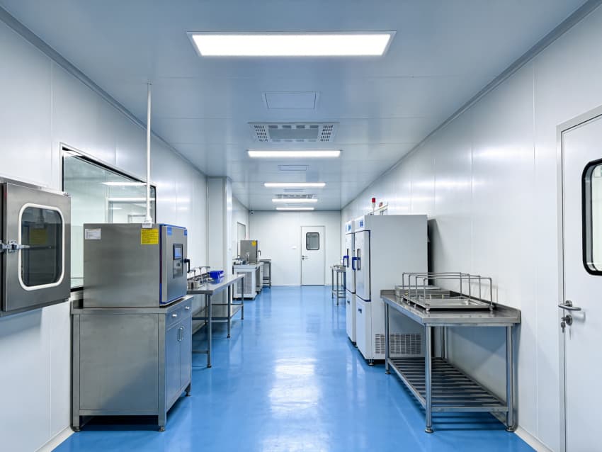墻面與頂板選用抗菌型潔凈彩鋼板,搭配圓弧角收邊與密封膠條,徹底消除積塵死角,便于高頻消毒清潔;地面為藍色防靜電環(huán)氧自流平材質,兼具耐磨、抗腐蝕、耐過氧化氫消毒的特性,同時通過加厚墊層實現(xiàn)微振動控制,保障精密器械裝配的穩(wěn)定性??照{通風系統(tǒng)采用萬級潔凈度設計,核心無菌裝配區(qū)配置局部百級層流罩,通過嚴格壓差管控(相鄰區(qū)域壓差≥10Pa)與定向排風,有效阻斷微生物氣溶膠交叉污染;排風末端加裝高效過濾器(HEPA),確保排放安全。