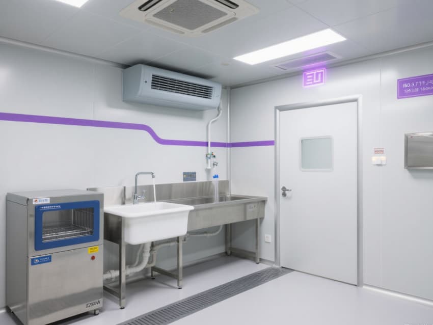空間配備嵌入式LED潔凈燈(照度≥400lux)、恒溫恒濕控制系統(tǒng)(溫度22±1℃,濕度50±3%),不銹鋼潔凈門窗采用高氣密性密封結(jié)構(gòu)。實驗區(qū)預(yù)留高精度儀器接口與防靜電接地端子,紫色氣流流線標(biāo)識引導(dǎo)操作動線,全方位保障精密實驗的準(zhǔn)確性與穩(wěn)定性。