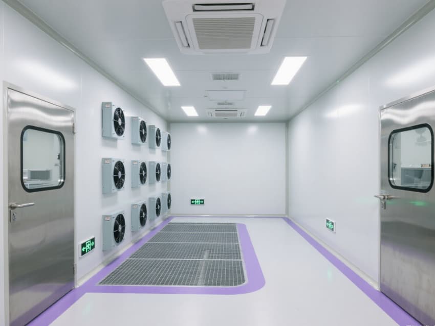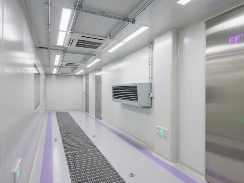 實驗室以銀白色抗菌金屬彩鋼板構(gòu)建墻體與吊頂,搭配淺灰色防靜電環(huán)氧地坪,金屬質(zhì)感與冷色調(diào)結(jié)合,既強(qiáng)化潔凈氛圍,又具備抗腐蝕、易消毒特性。墻面與地面的圓弧過渡設(shè)計消除積塵死角,頂部密布的FFU風(fēng)機(jī)過濾單元形成垂直層流,配合側(cè)下回風(fēng)系統(tǒng),實現(xiàn)每小時25-30次空氣置換,持續(xù)維持室內(nèi)正壓。?