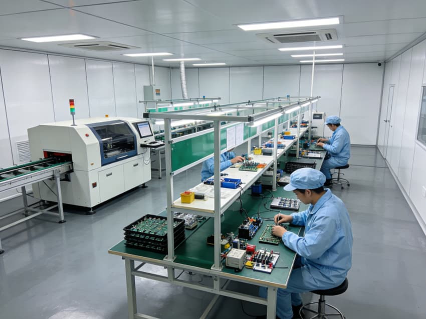 手工組裝與測試區(qū):采用模塊化防靜電工作臺(tái)布局,每個(gè)工位配備獨(dú)立電源接口與靜電手環(huán)接地端,線性燈帶提供均勻照明,旁側(cè)通風(fēng)系統(tǒng)有效驅(qū)散焊接產(chǎn)生的熱量與煙塵。
