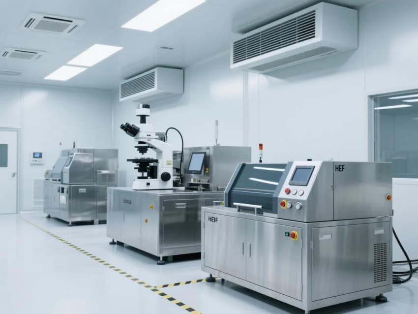 天花采用模塊化FFU(風(fēng)機過濾單元)系統(tǒng),配合高效HEPA過濾器,維持穩(wěn)定的氣流組織與潔凈度。設(shè)備區(qū)采用淺灰色不銹鋼圍擋,與白色潔凈墻面形成視覺區(qū)分,同時便于日常清潔維護。嵌入式LED無影燈帶提供均勻照明,減少作業(yè)陰影。整體設(shè)計強調(diào)功能性、安全性與可持續(xù)性,滿足電子光學(xué)制造的高標(biāo)準(zhǔn)環(huán)境需求。