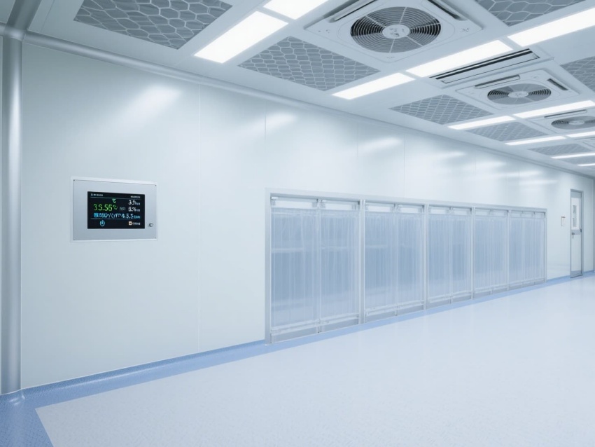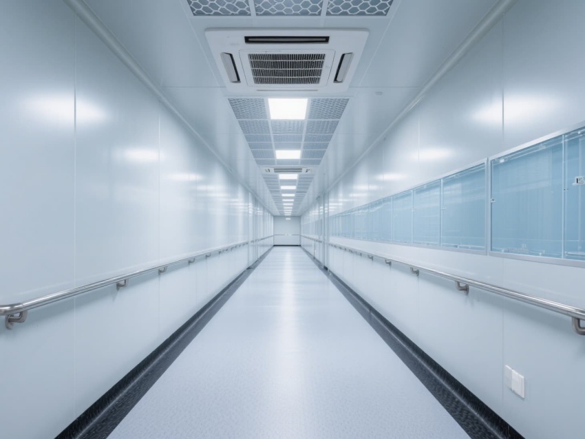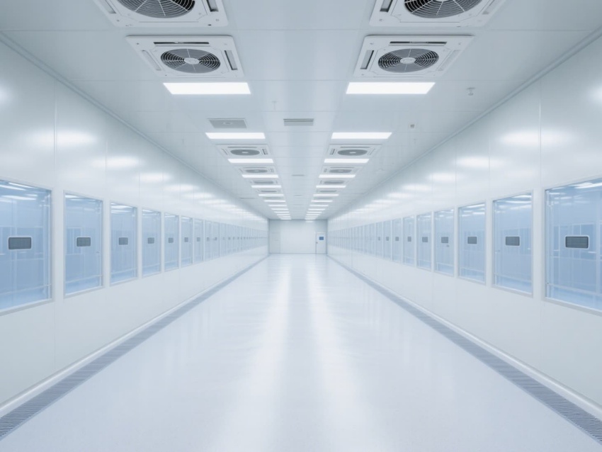 電子芯片廠無(wú)塵車間是芯片高精度生產(chǎn)的核心空間,其設(shè)計(jì)嚴(yán)格遵循百萬(wàn)級(jí)潔凈標(biāo)準(zhǔn)。車間以銀白色抗菌彩鋼板搭建墻體與吊頂,搭配淺灰色防靜電環(huán)氧地坪,形成簡(jiǎn)潔統(tǒng)一的視覺(jué)基調(diào)。頂部密布的高效過(guò)濾器與FFU風(fēng)機(jī)組,通過(guò)層流方式持續(xù)凈化空氣,確保每立方米空氣中0.5微米以上的塵埃顆粒不超過(guò)3520個(gè)。?