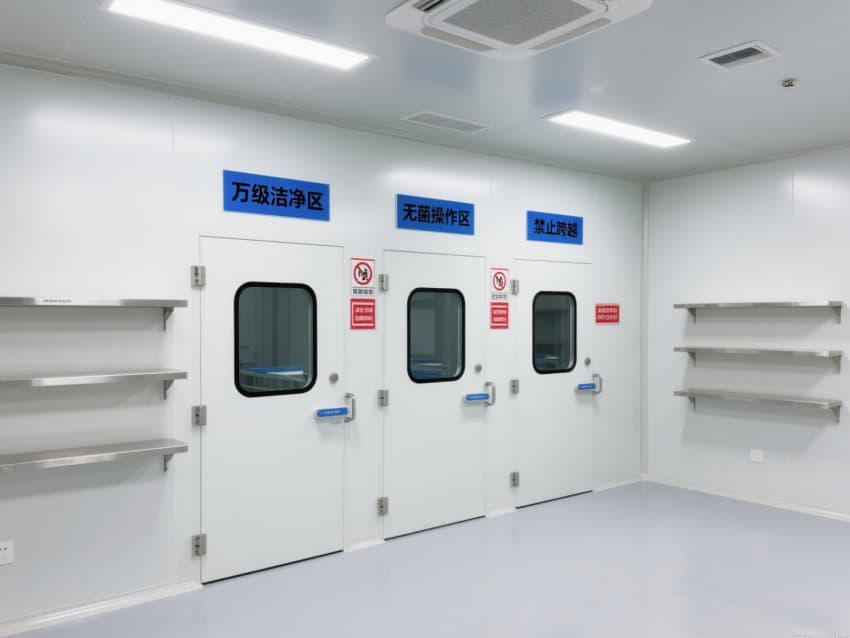空間內(nèi)配備不銹鋼潔凈門(mén)窗與雙扉傳遞窗,均采用高氣密性密封結(jié)構(gòu);嵌入式LED潔凈燈提供300-500lux均勻照明,無(wú)眩光設(shè)計(jì)保障操作精度。恒溫恒濕系統(tǒng)精準(zhǔn)控制溫度(20-24℃)、濕度(45-60%),藍(lán)色功能標(biāo)識(shí)線清晰劃分操作動(dòng)線,全方位營(yíng)造安全、穩(wěn)定的萬(wàn)級(jí)無(wú)菌環(huán)境。