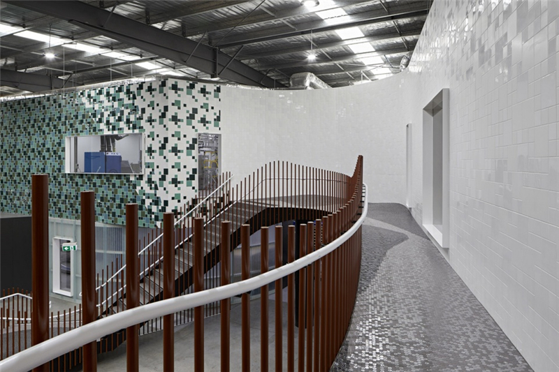 多彩的線條從附近的自然保護區一直延伸到位于生產區核心地帶的巨型壁畫上,吸引著員工和參觀工廠的訪客。產自本地的澳洲硬木和紋理豐富的墻面從外部景觀“流進”室內,在自然光線的配合下營造出富有生機的氛圍。