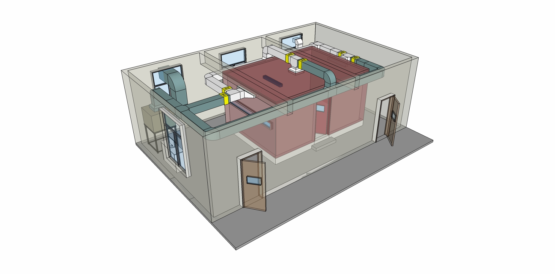 實驗室分為外室和內室兩部分。內室為主要的實驗平臺,放置呼吸暖體假人和VOAG,通過外室的空調系統、恒溫恒濕系統向內室送入恒定溫度和濕度均勻的新風,提供恒定的溫濕環境,整套系統采用全進全排的方式,不回風。外室放置空調機組、恒溫恒濕機柜。